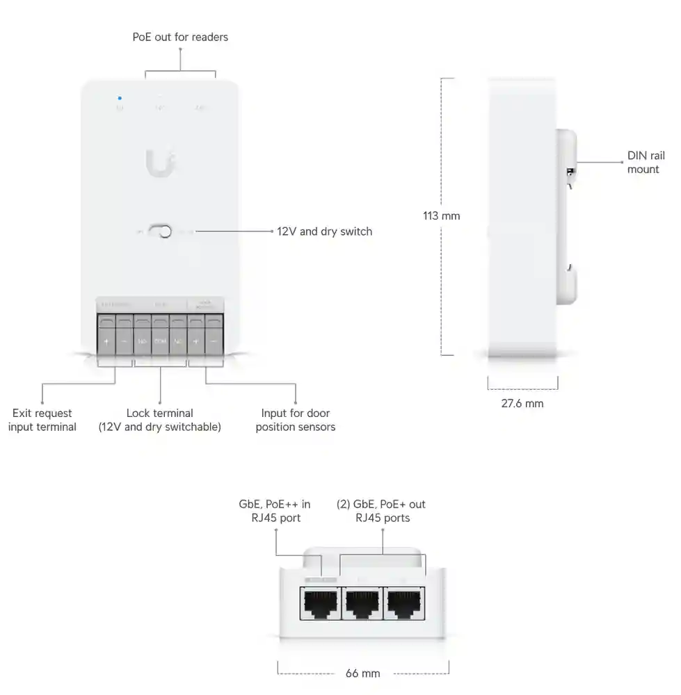 (1) PoE++ input, 50V DC, 1A (2) PoE outputs, 50V DC, 30W per port (Max 45W aggregated) |