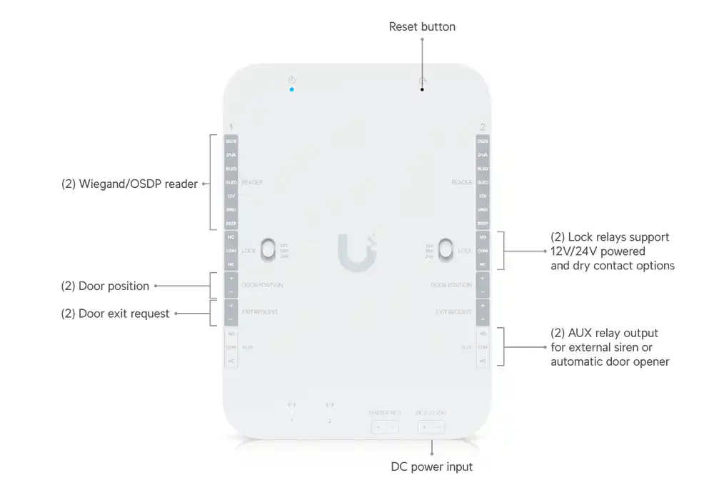 (2) Third-party Wiegand Reader / UniFi Retrofit Reader (2) Door exit request (2) Door position (1) Emergency |
