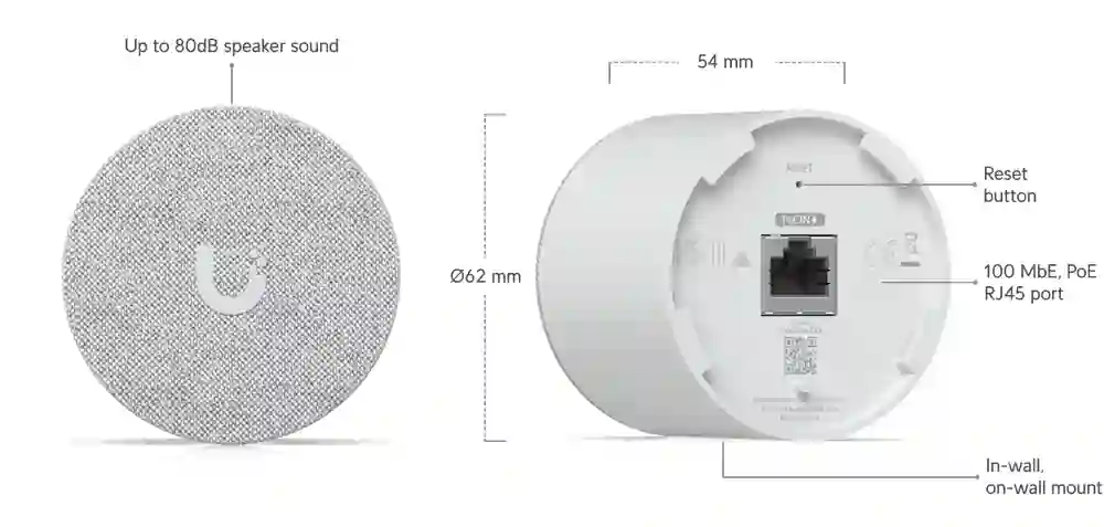 | Dimensions | Device: ⌀62 x 54 mm (⌀2.5 x 2.1″) In-wall mount: ⌀89 x 63.1 mm (⌀3.5 x 2.5″) On-wall Mount: ⌀62 x 20.2 mm (⌀2.5 x 0.8″) |
